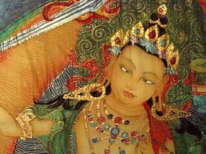 ist sein bekanntestes Mantra. In der Linken hält er einen blühenden Lotos, worauf ein Band des Prajnaparamita-Sutra liegt. In den Sutren heisst es, Manjushri besitze in einem anderen Universum ein Reines Land, und dort manifestiere er sich als der Buddha der er tatsächlich sei.
