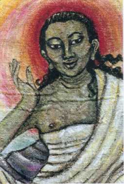 Per poter ascoltare meglio la musica della stratosfera, Milarepa tiene una mano appoggiata all'orecchio.